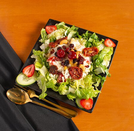 Tender, slow-cooked chicken breast tossed in a rich, creamy sauce infused with herbs and garlic, topped with a medley of sun-dried tomatoes, cranberries, golden and dark raisins.Served on a bed of fresh romaine lettuce with sliced strawberries and cucumber for a refreshing contrast.